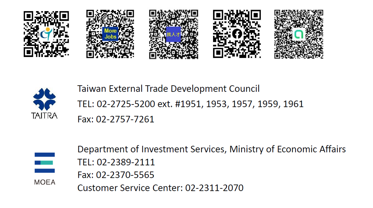 Contact TAIWAN: https://contacttaiwan.tw/MainOne/Home.aspx Job Fairs Contacts: jennfr@taitra.org.tw